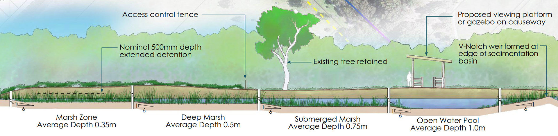 These concept illustrations were developed to present a solution for managing water quality flowing from the Bayswater Main Drain into the Swan River. The design shows drain water intercepted near the river edge before flowing through a series of wetlands of various depths with vegetated filtration zones.