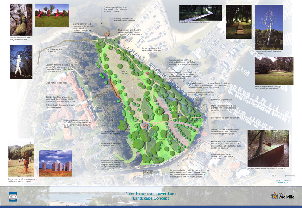 Following on from this work, David developed a landscape concept for the lower lands adjacent to the yacht club. This process included community engagement to help understand expectations for use of the area. Drawings were refined in response to feedback and issued for wider public comment by the City of Melville.