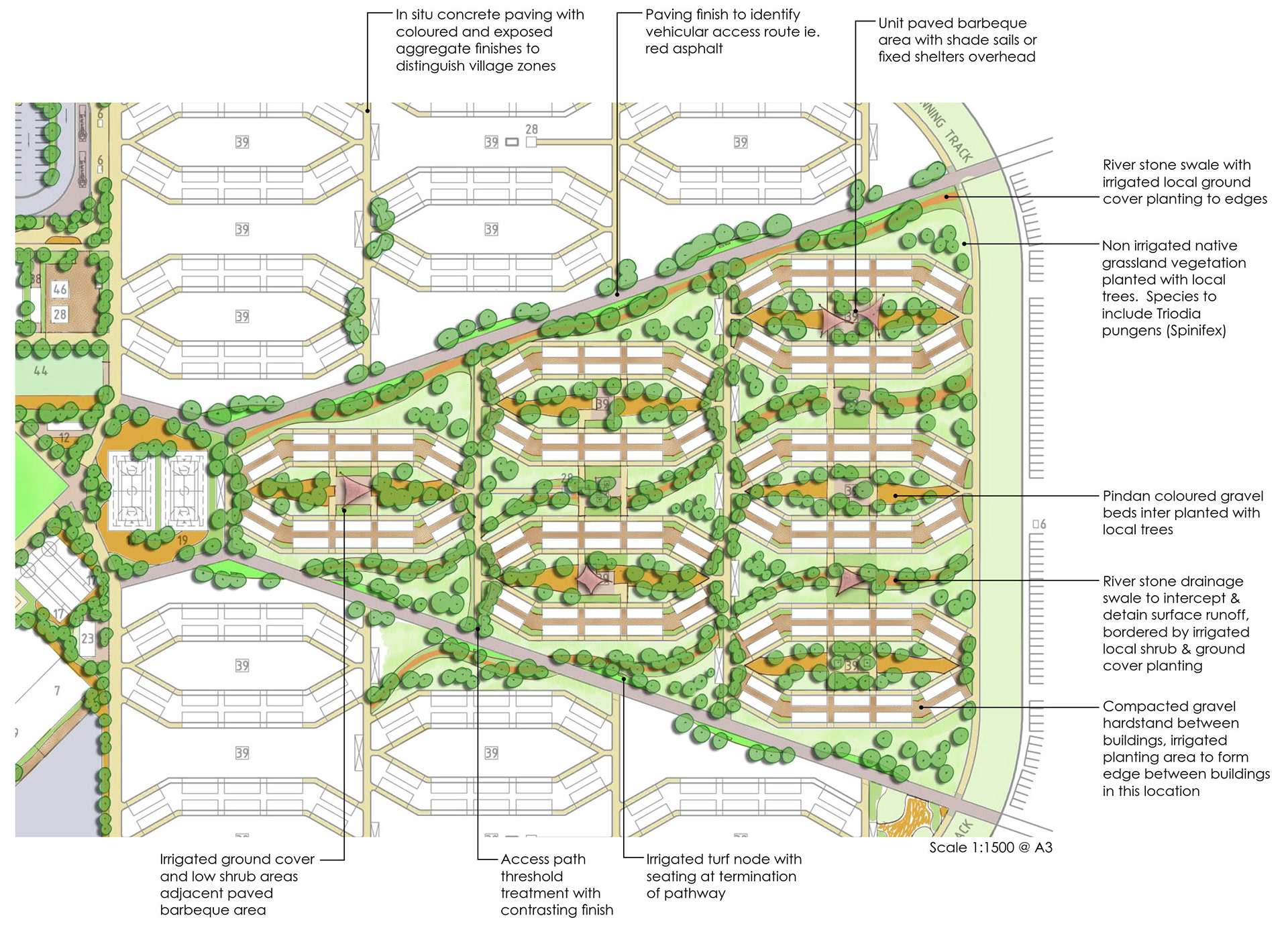 David’s work on this project included the development of concepts and documentation for soft and hard landscaping with the objective of creating attractive, low maintenance, water sensitive outdoor spaces to provide high levels of amenity for village residents .